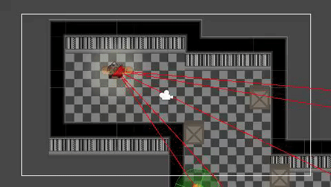 Here you can see how the raycasting function works. The enemy "knows" where the player is at all times, but will essentially pretend they cant see them. Once the player is in view of the enemy, the behaviour changes as described above, triggering the chasing and shooting behaviour.